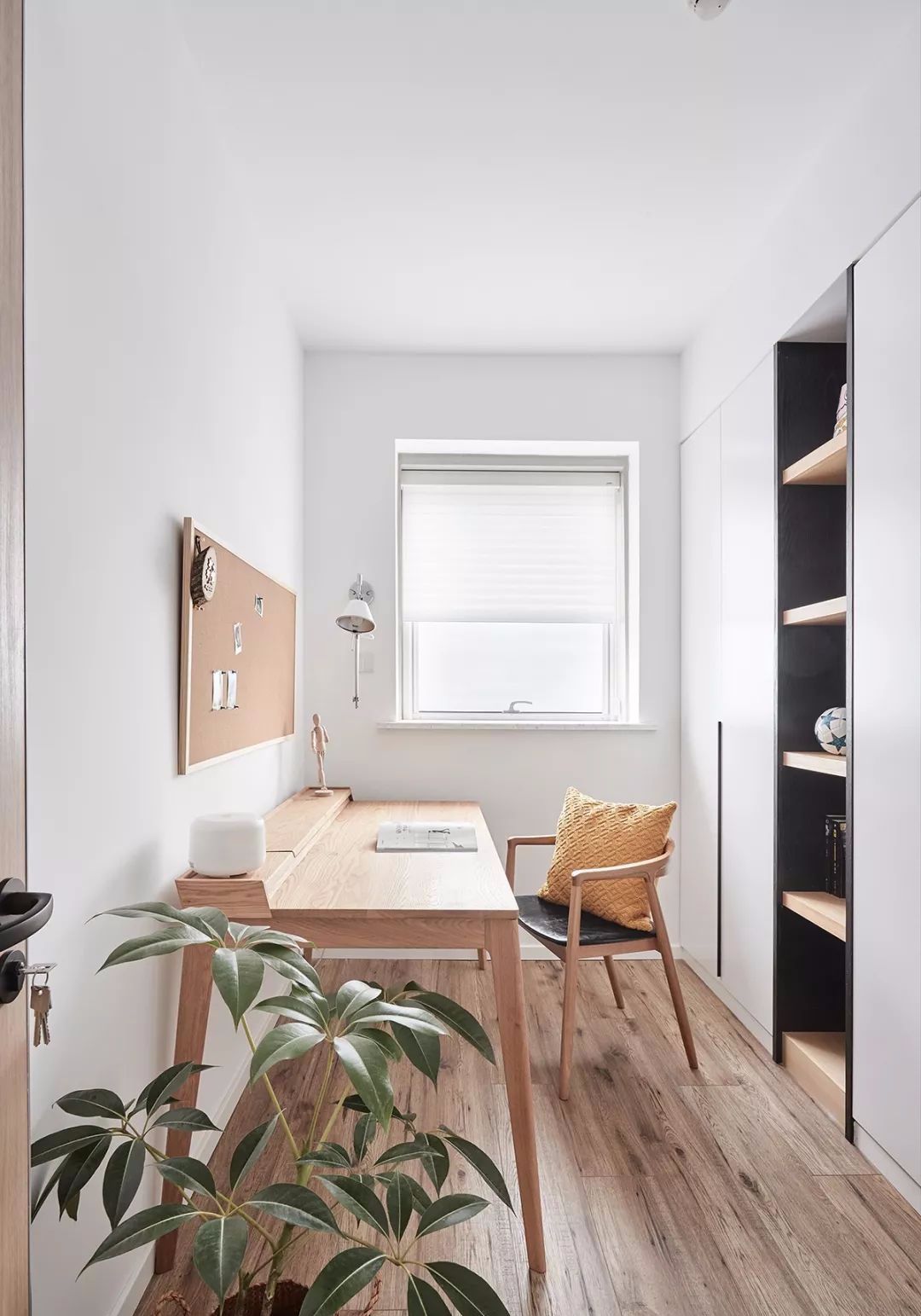 书桌椅来自木智工坊,哑光的原木质地很。开放式赠送的书房很小,加了一面书柜以兼顾收纳和展示的需求。