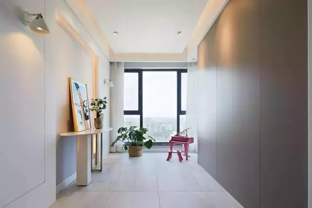 玄关和客餐厅之间也还有着一个走廊过道的空间,走廊的两侧做上嵌入式的柜子,还加上了一些藏光的设计,让走廊过道看起来更时尚。