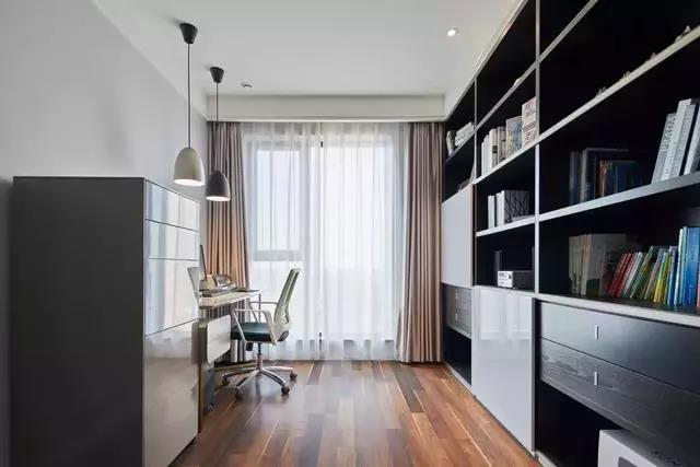 书房处选择了布置成更为沉稳大气的样子,书房内的柜子做了黑木色的,把其中大部分空间做成开放式的搁架,这样找想要的书籍就会更方便。
