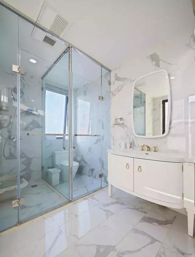 主卫被布置成了三式分离的样子,把洗手台、马桶和淋浴房给完全分开,避免了水汽侵蚀的问题。在淋浴房内准备一个儿童浴缸,帮孩子洗澡也轻松一些。