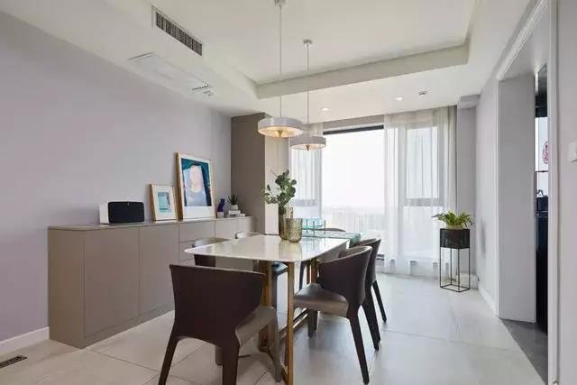 位于客厅另一侧的餐厅空间布置也非常简单,餐桌选择了大理石加金属的款式,看起来会更大气一些。餐边柜上方摆放多幅挂画,带来更为文艺的感觉。