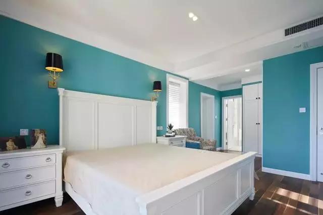 主卧室的面积是非常宽敞的,墙面被刷成了青蓝色,搭配白色的家具看起来更为清新和明亮。对称摆放的床头柜和衣柜结合,也满足了屋主的收纳需求。