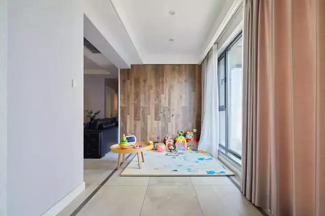客厅外的阳台是和儿童房阳台连在一起的,设计师选择把其中一部分作为孩子的娱乐区设计,一块地毯加上一些玩具就是孩子非常喜欢的角落了。