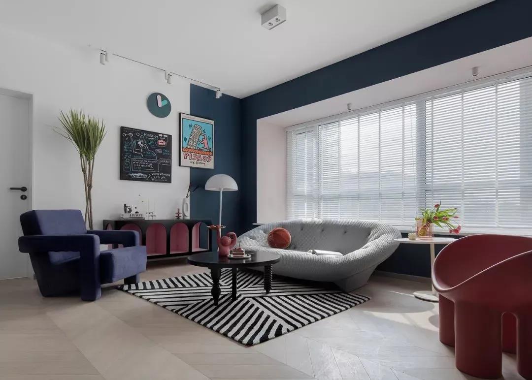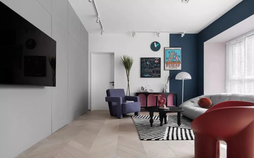 客厅电视机背景墙没有采用任何装饰,灰色的布艺沙发,旁边还放着一张紫色单人沙发,地上铺的是黑白相间的竖条纹地毯。虽然色彩丰富,但是看起来丝毫不会杂乱。