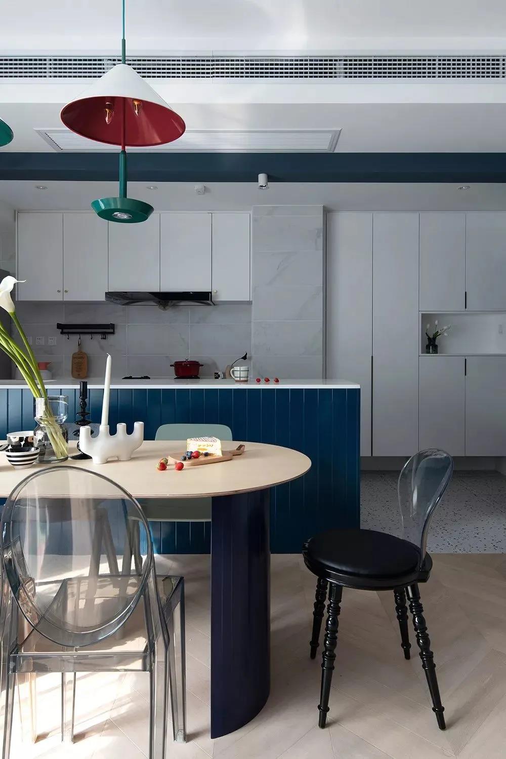 首先是厨房和餐厅采用的是餐厨一体化设计,吧台的设计不仅可以用来作为放东西的台子,还能当做餐桌。深蓝色和白色的结合看起来简约大气。