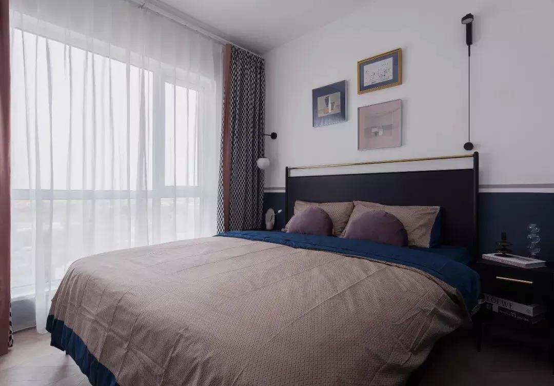 次卧空间较小,床头背景墙挂了几幅画,窗边的床头柜上可以摆上几本爱看的书刊。