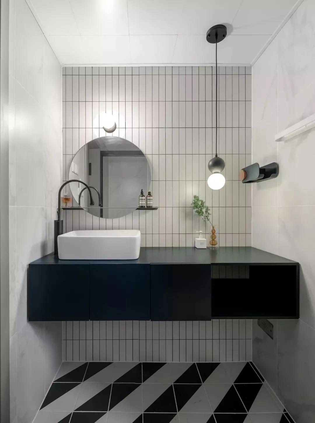 卫生间洗手台装了三盏吊灯,非常的明亮。采用经典的黑白搭配,简约又不繁琐。