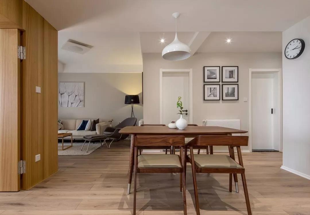餐厅作为中转站,连接了客厅、卧室和书房等多个空间,复古木质的餐桌椅摆放在通道的正中,四周都选择留空,方便通行也方便餐椅的移动。