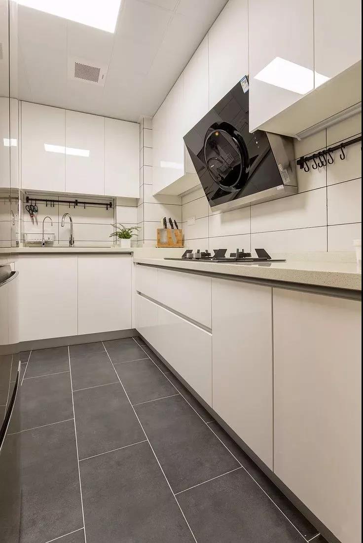 厨房内部的空间还算宽敞,L形的橱柜布局方案满足了使用需求,把冰箱也放在厨房内,整个厨房的动线合理又比较短,操作起来非常方便。