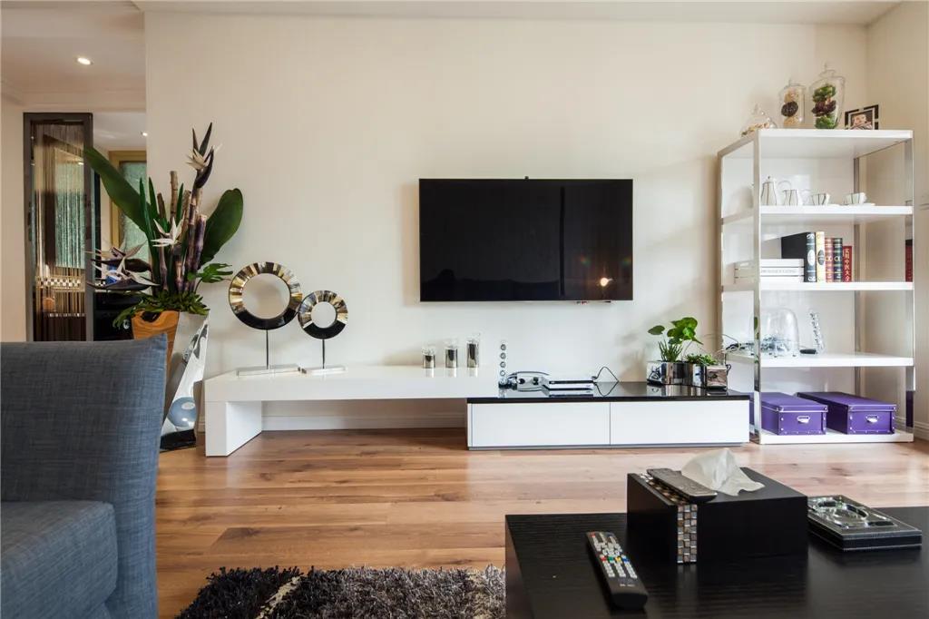 客厅电视背景墙没有做造型,旁边放个置物架就很好看了。