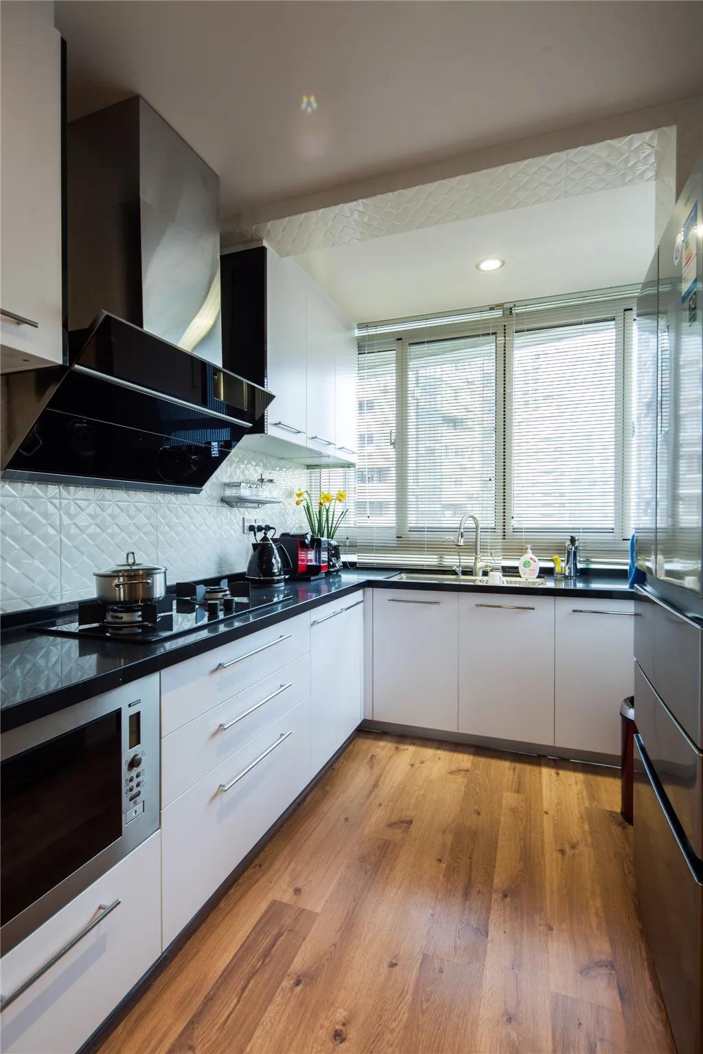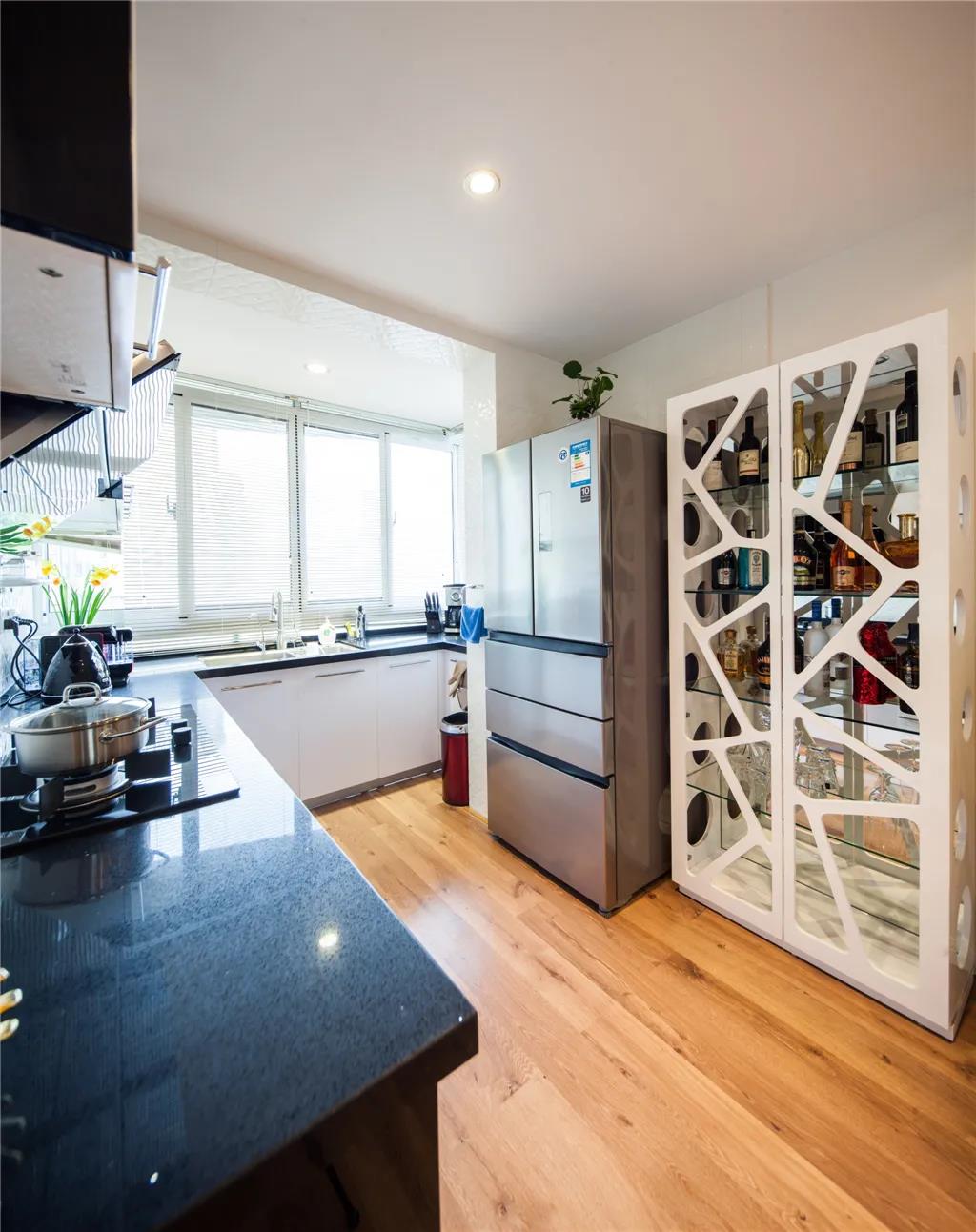冰箱旁边是一个白色边框的柜子,起到了餐边柜的作用又点亮了空间,起到了过渡修饰的作用。