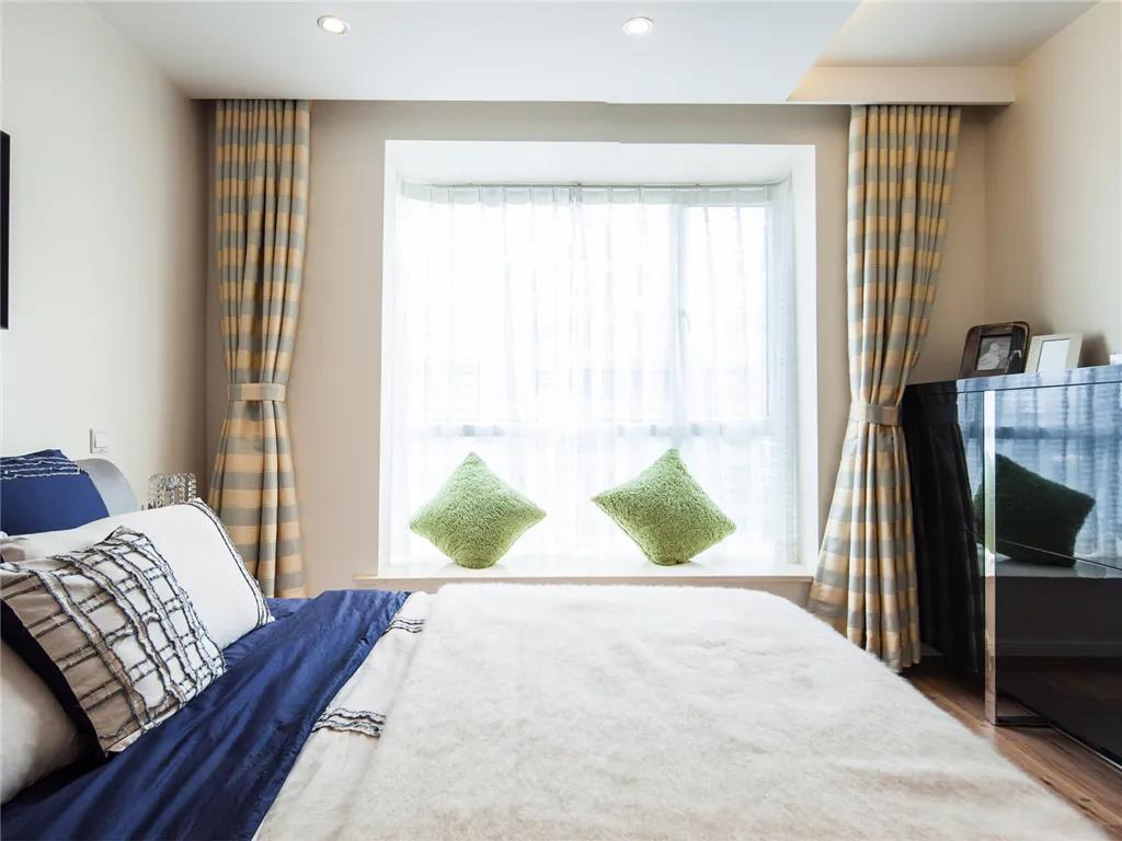 主卧有一个大飘窗,采光很好,藏青色和米色的搭配,非常的温馨干净。