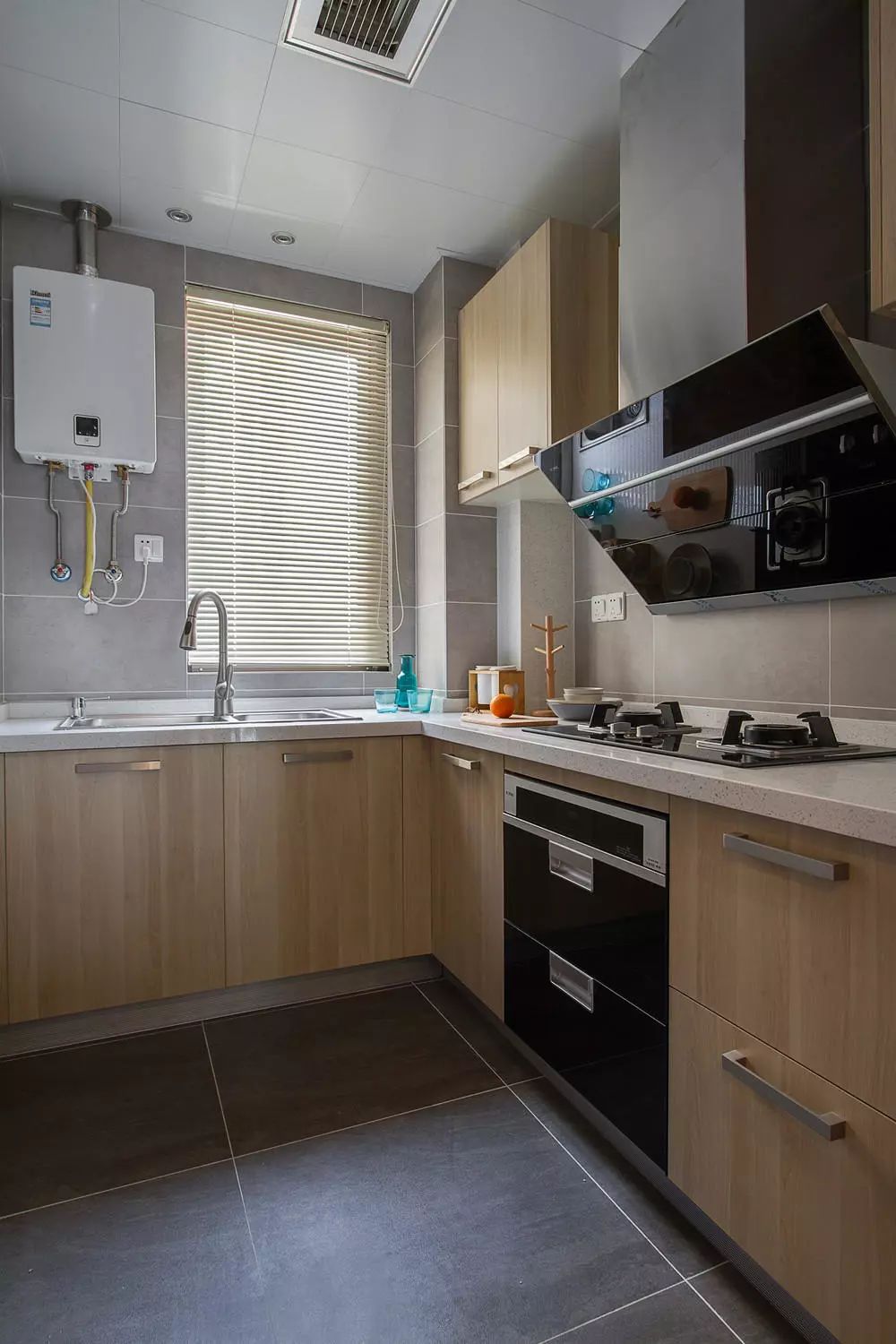墙面采用了浅灰亚光砖与木门橱柜门板的结合,实用耐脏,原木墙面的凹口进行了扩大,使其容得下一台微波炉
