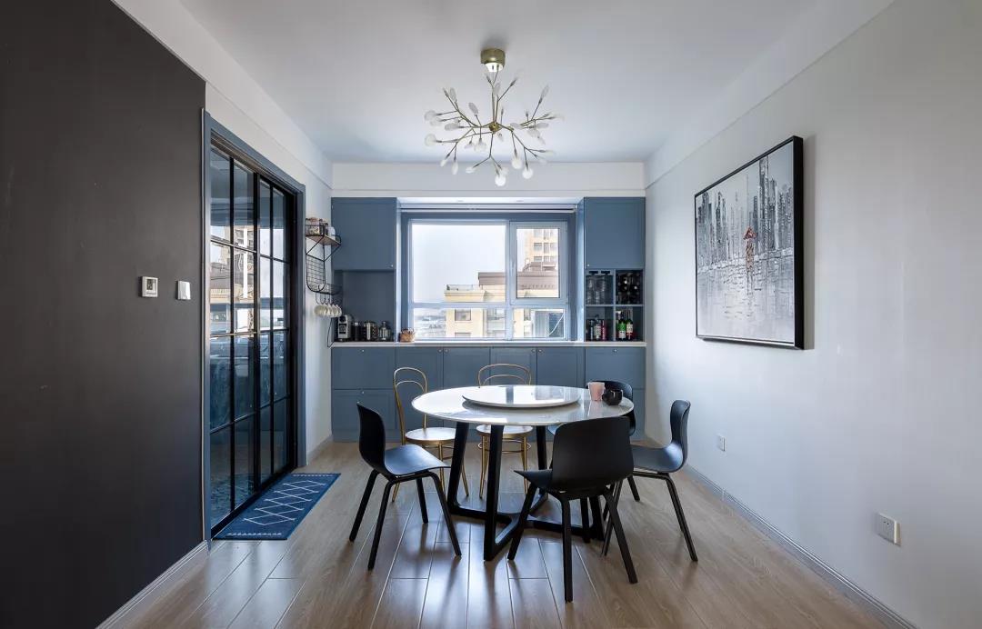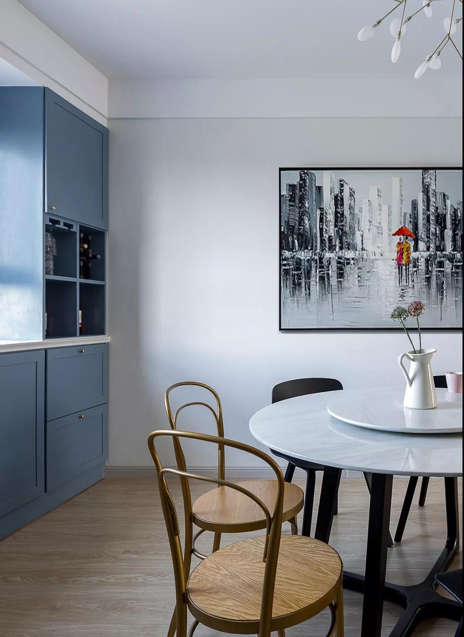 餐厅背景墙上有一幅挂画,一对情侣撑着一把伞,走在下雨的城市街道上,紧紧地依靠在一起,更加渲染了一种温暖的氛围。金属质感餐椅,大理石的餐桌面,非常时尚,又很优雅。