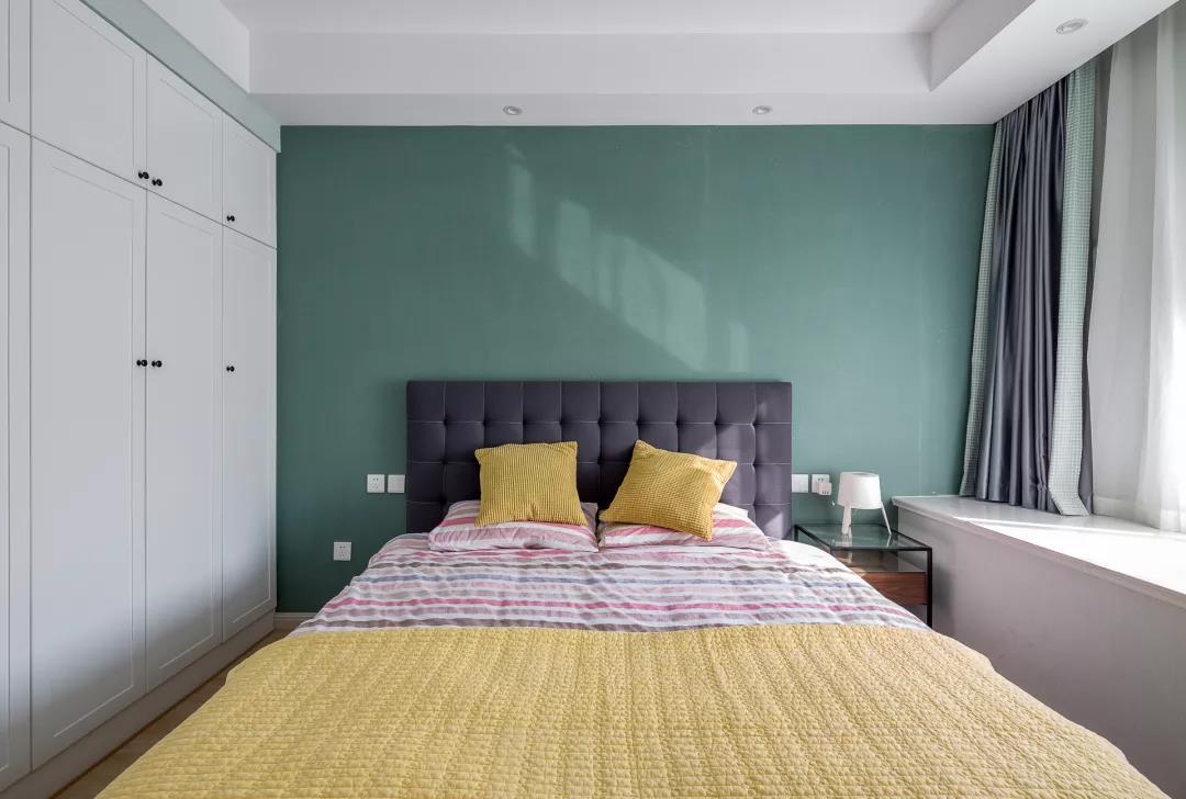 主卧室的背景墙的墨绿色非常漂亮,深灰色的床头靠背,黄色的床上抱枕,纯白色的飘窗和衣柜,很简约舒适。