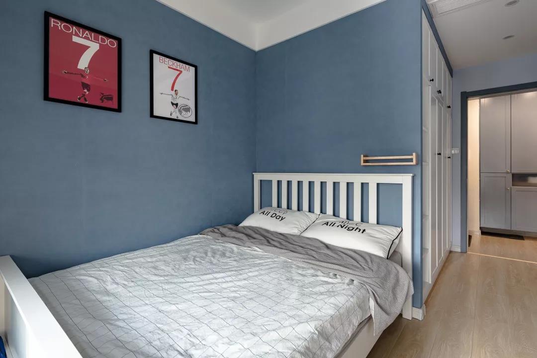 次卧的墙壁上挂了两幅球员的照片,看来是一位球迷,床的宽度刚好是墙壁的宽度,靠墙摆放,在床头的墙壁上,设计了一个小搁板,可以挂一些小东西。