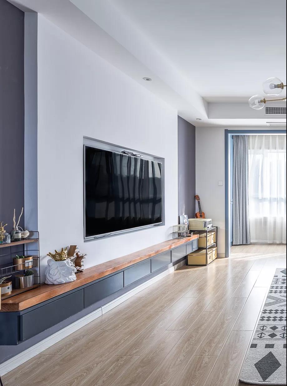 电视机采用的是嵌入式的,不占用空间,与电视背景墙融为一体,电视背景墙在造型上也没有做过多的设计,一面纯白的墙壁,简单干净。深灰色的电视柜,可以放置很多东西。