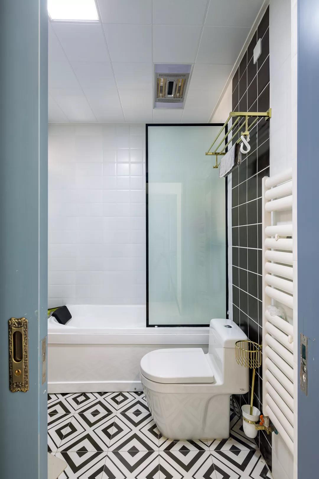 卫生间设计了浴缸,没有单独设计淋浴,磨砂玻璃隔了一边,可以站在磨砂玻璃区域内淋浴,旁边是马桶。卫生间里层次比较分明,黑色菱形瓷砖比较干净整洁。