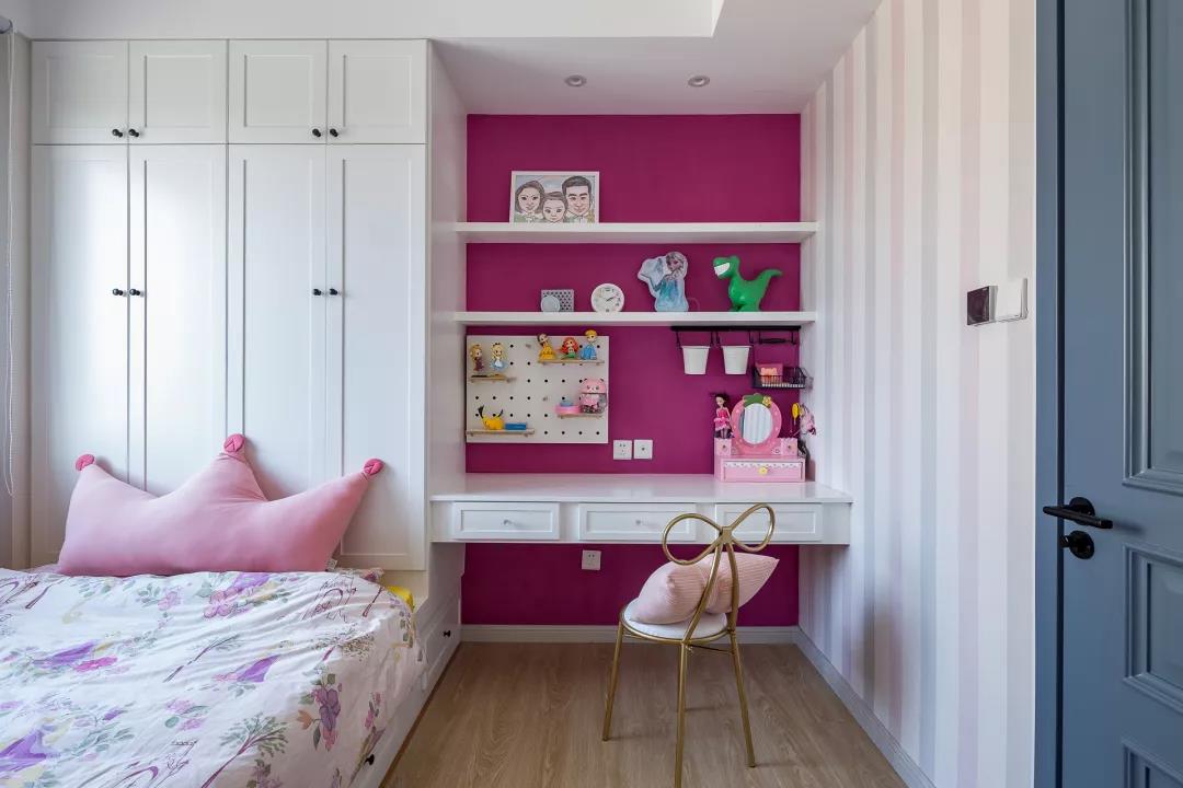 儿童房就很公主风了,粉红色的皇冠枕头,金属质感的椅子,靠背是一个可爱的蝴蝶结,床头设计了书桌,小公主可以在这里写作业看书,因为在角落里里,怕光线不足影响视力,所以在天花板上单独设计了点射灯,最上面的搁板是一家三口的漫画图,非常可爱。