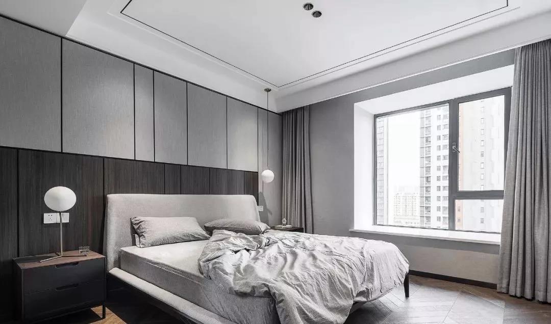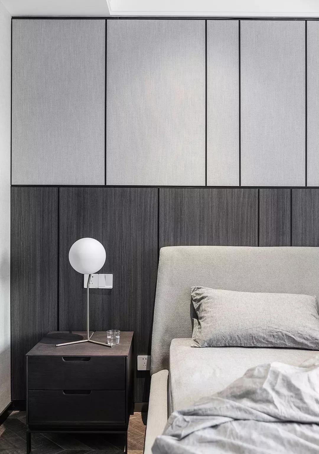 主卧延续了公区一致格调,灰的色调下,让空间气质十足。不同造型分割的布墙布系统背景墙为空间增添一份稳重,阳光倾泻下来的午后,让卧室更为温馨。