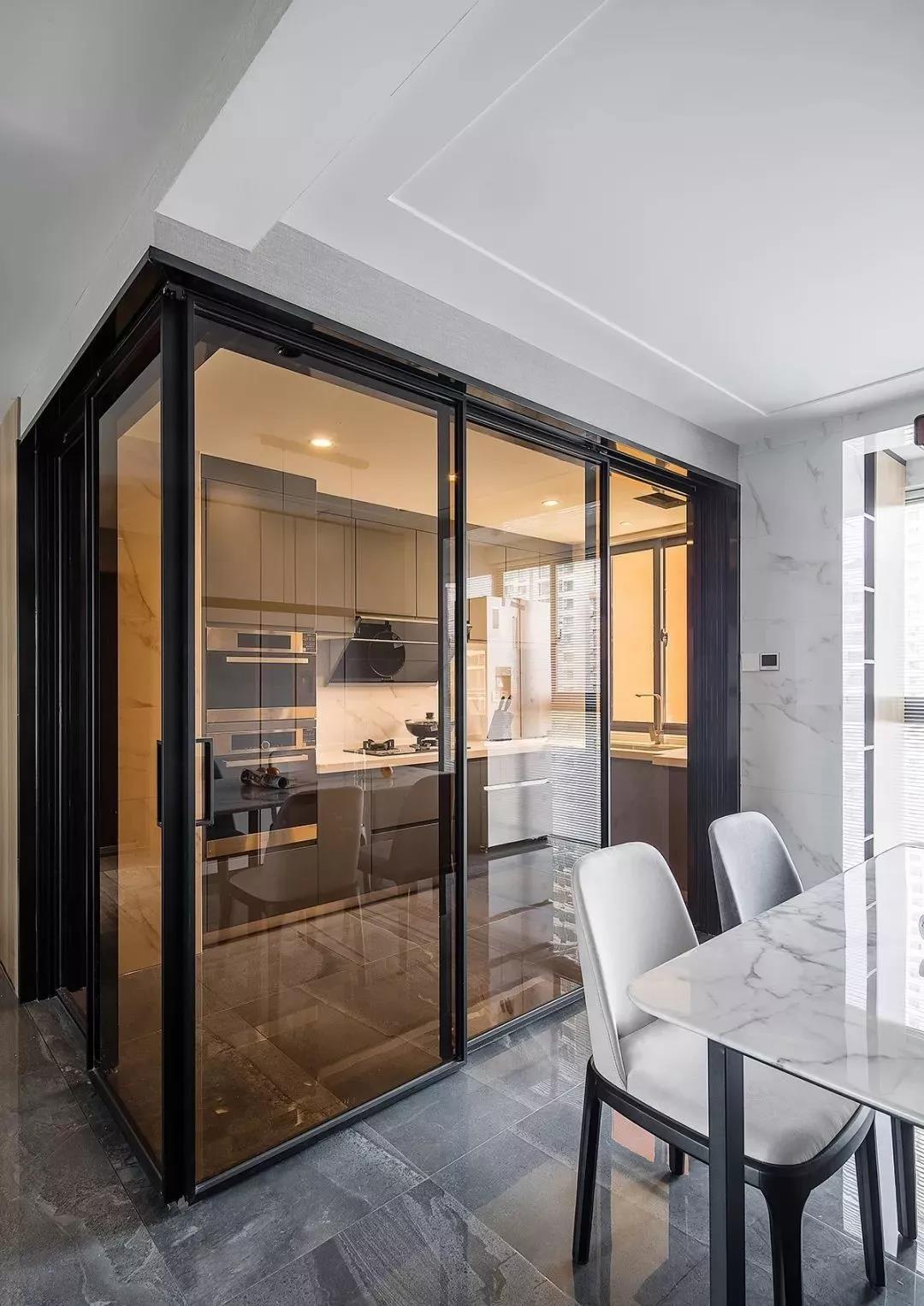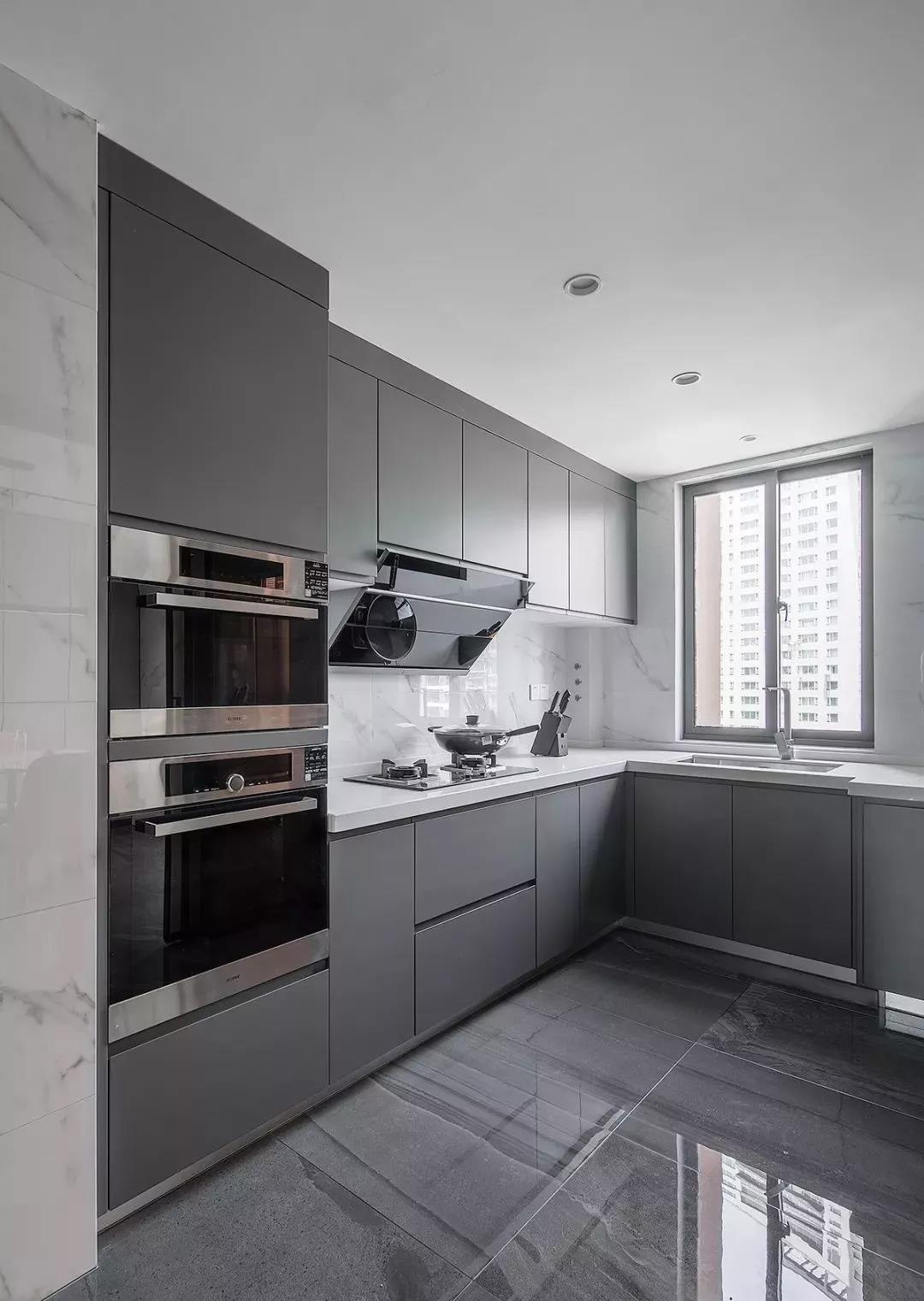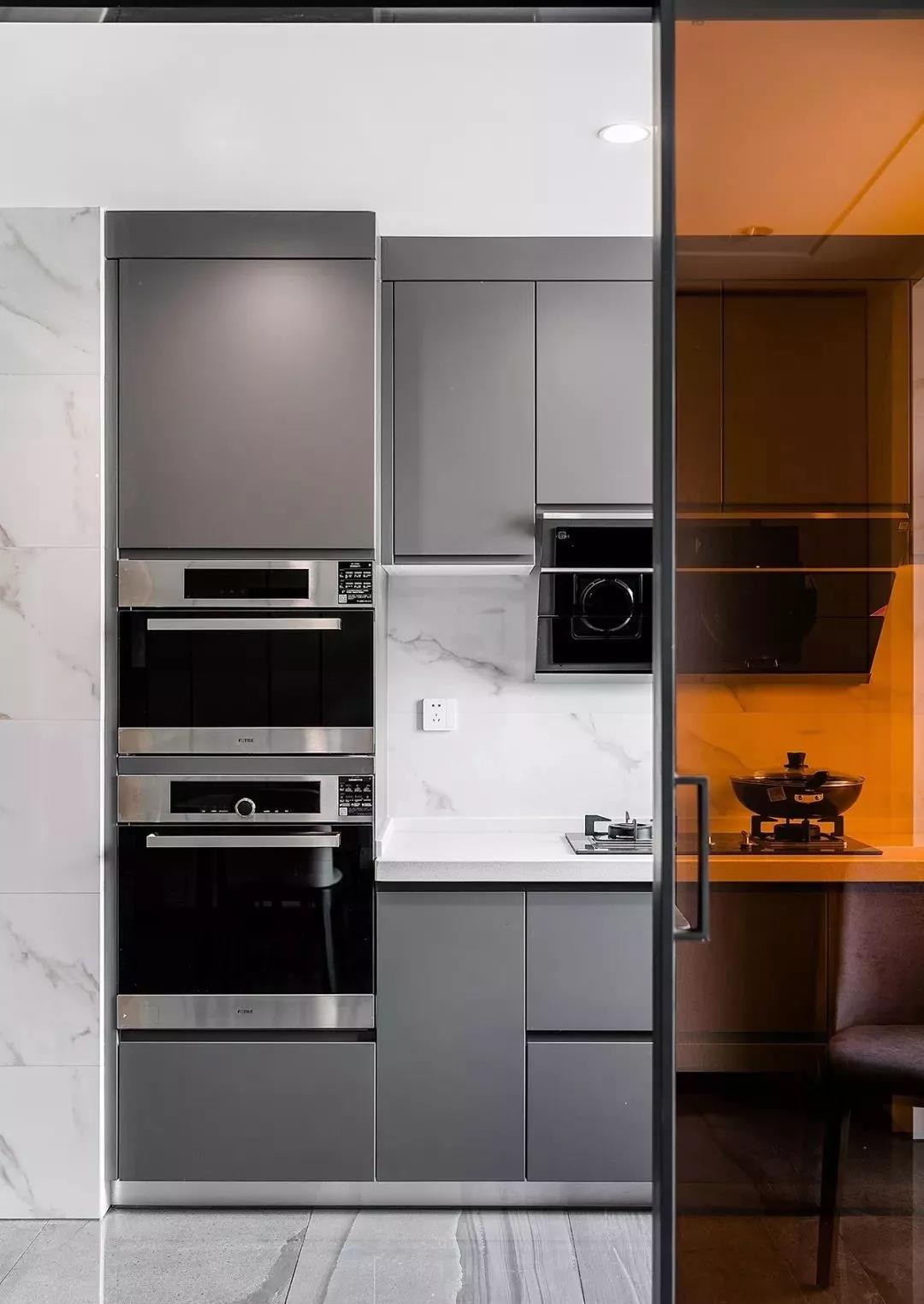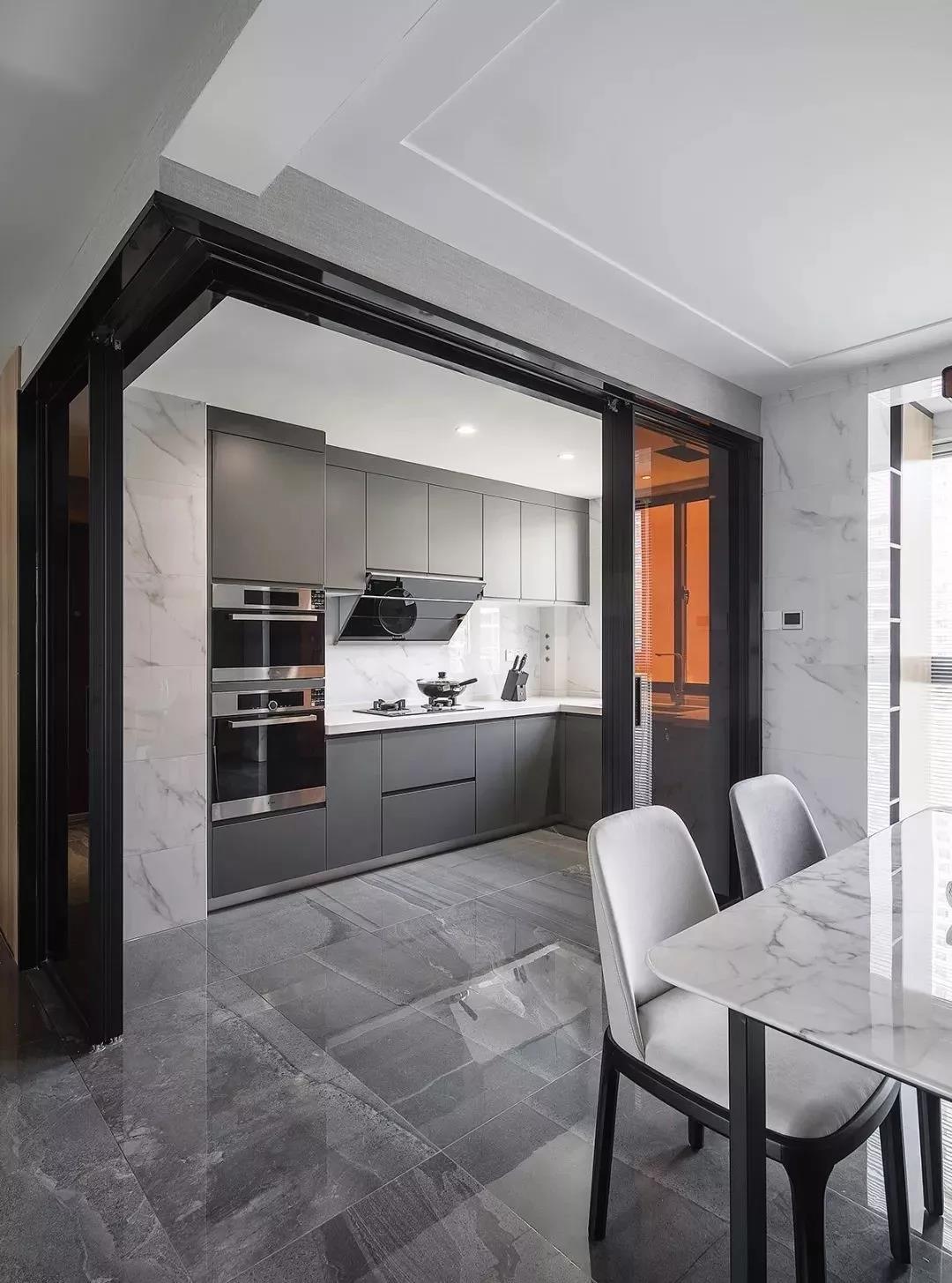空间的开合,色彩的解构,在不同的状态和光线下,充满不同的趣味与变化,厨房橱柜采用灰色柜体与白色石材台面,搭配时尚的灰色地砖与爵士白瓷砖,相互呼应,相得益彰。