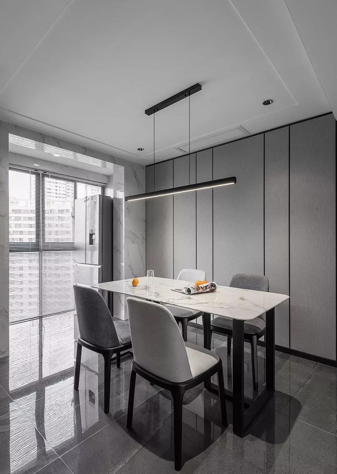 餐厅灰的布墙布系统,不同分割的金属线条点缀,提升空间的耐看度与品质感,极简的吊灯,聚焦视线,让空间更有层次。