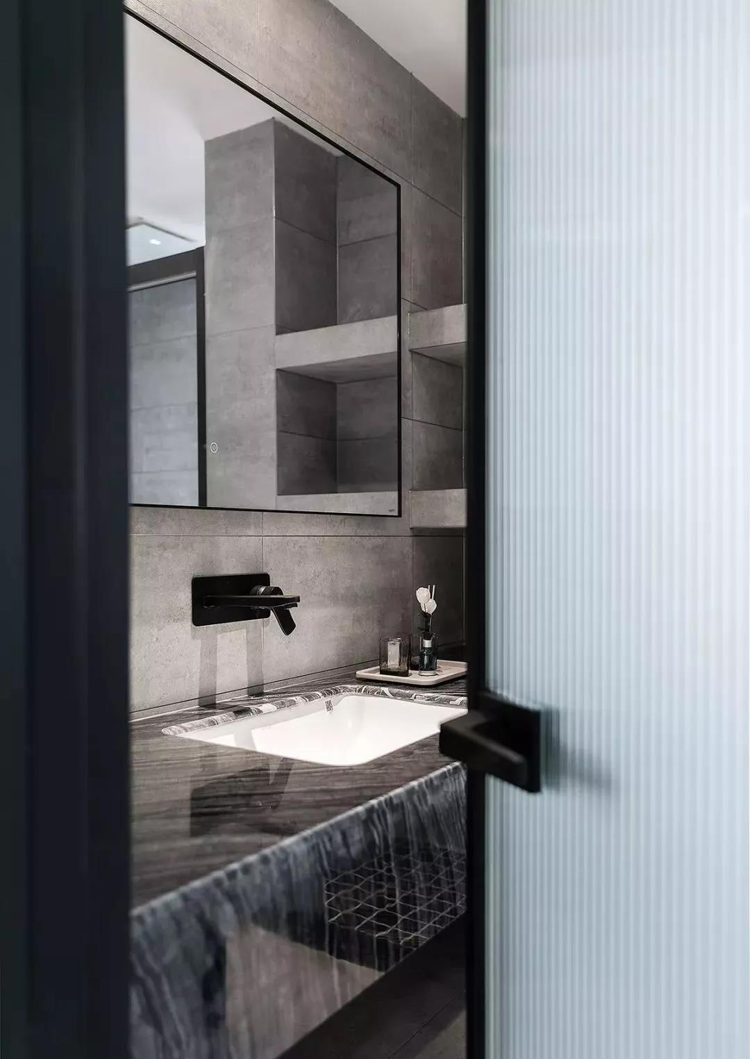 延续整体风格的色系,采用哑光面的灰色系瓷砖,搭配现代极简的黑色长虹磨砂门,显得个性时尚。