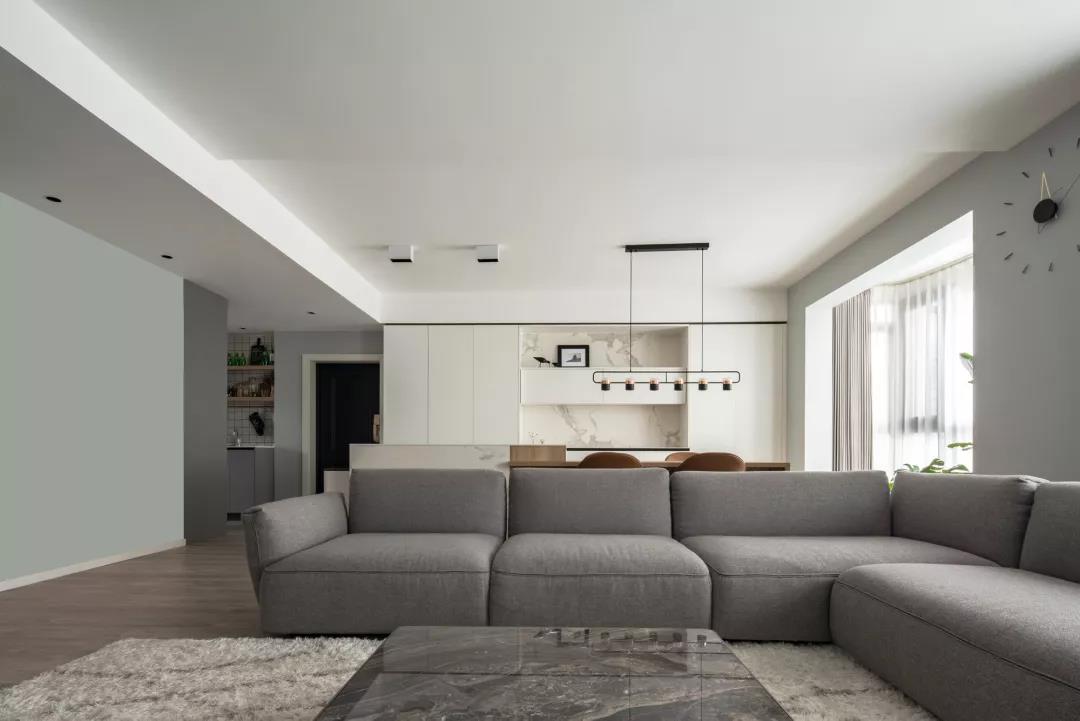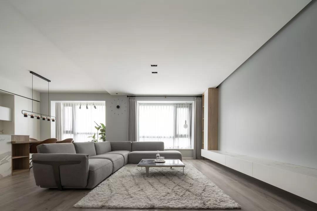 ▲客厅以简洁的浅灰色空间基调,没有主灯的设计,天花显得格外的极简大方。电视墙大面积的留白,定制上一个电视柜,也是显得简雅而大方。中间垫上米白色地毯,结合大理石质感的茶几,布置出一个简单雅致的气质。