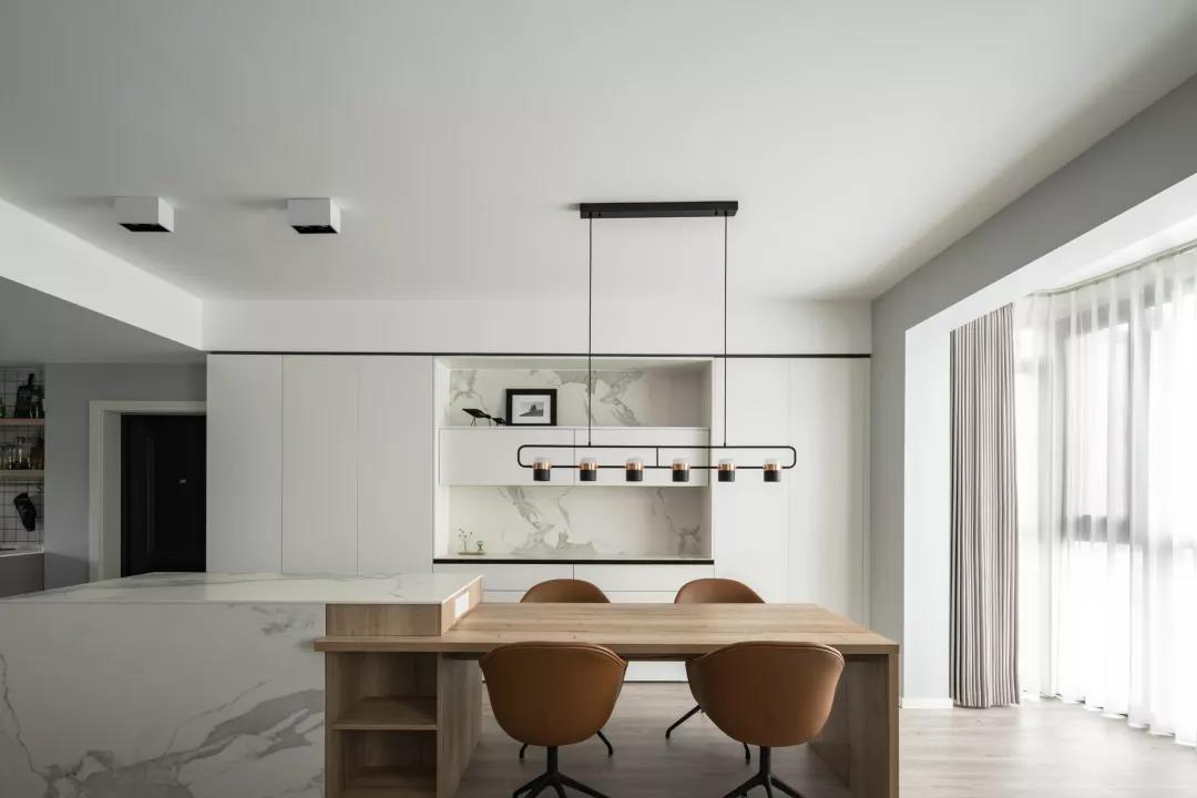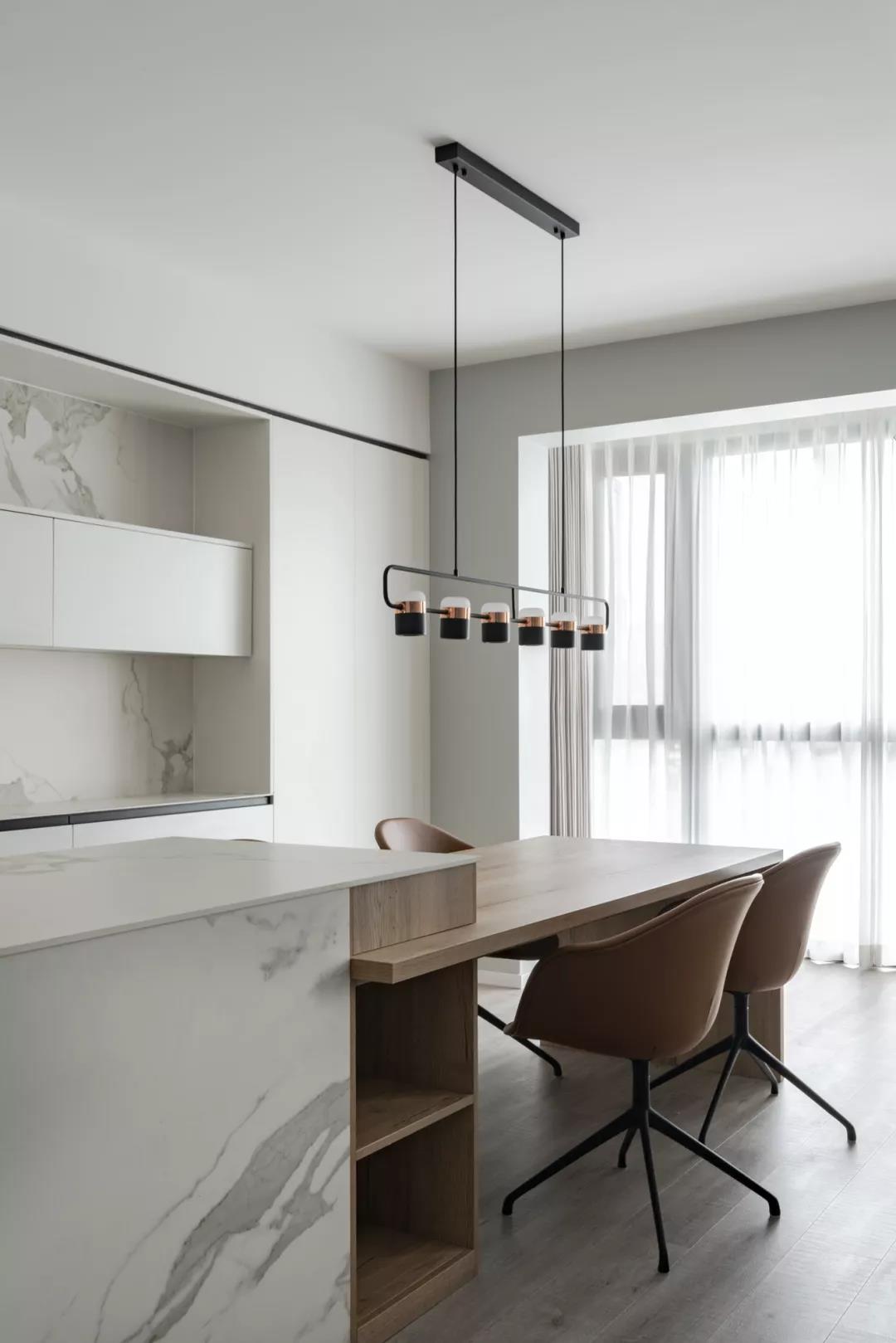 ▲餐厅的木质餐桌连着大理石质感的中岛台,在干净洁白的空间下布置上木质餐桌与棕色餐椅,为一家人带来的是一种淡雅端庄的用餐仪式感。