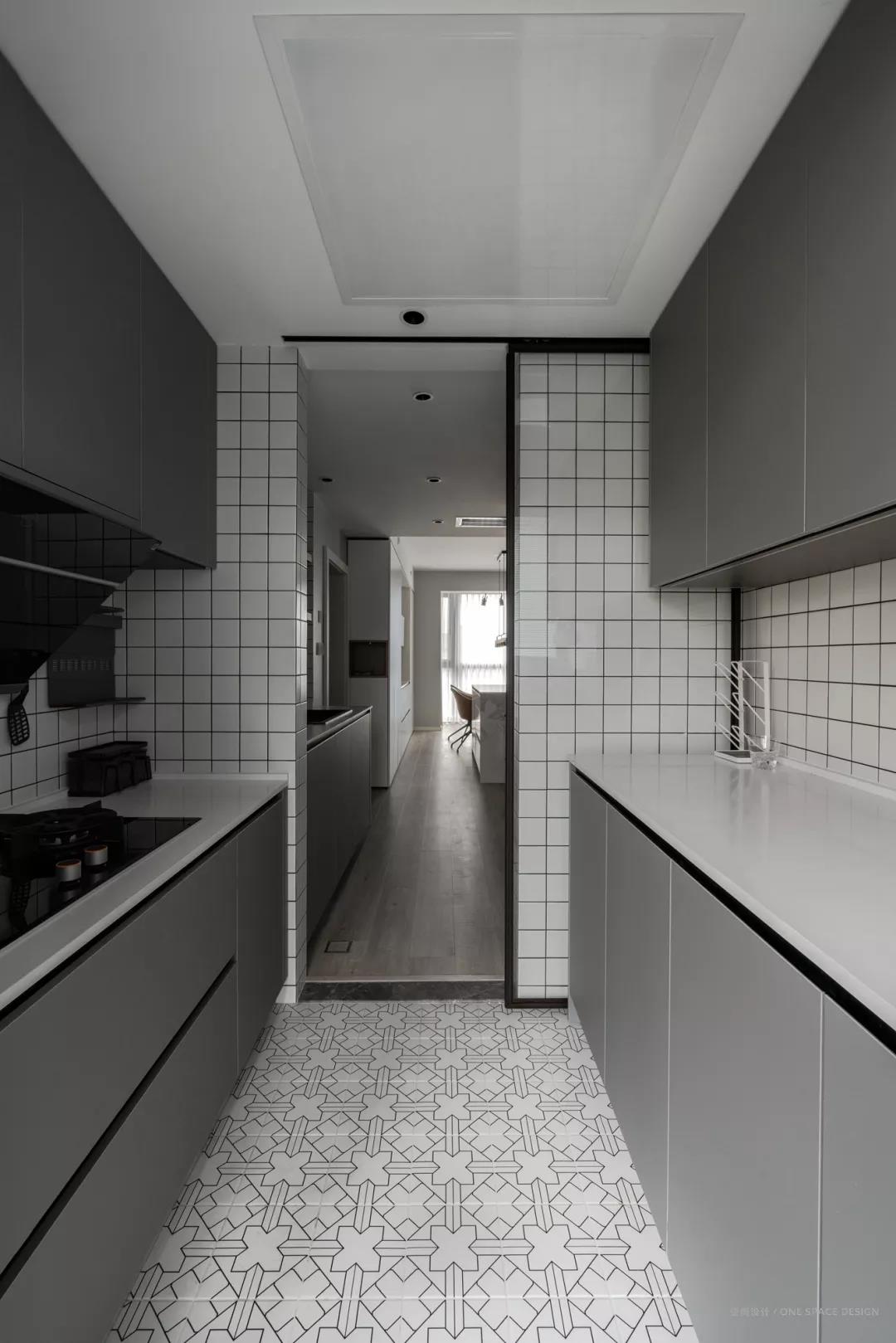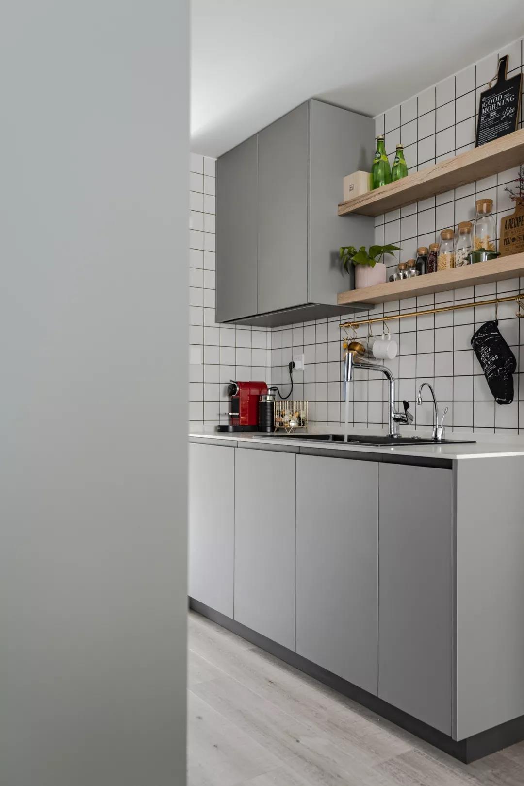 ▲中厨区域,二字型的操作台格局,白色花砖、灰色橱柜、墙面是白色小格砖,整体简约文艺,也让做饭显得轻松方便。