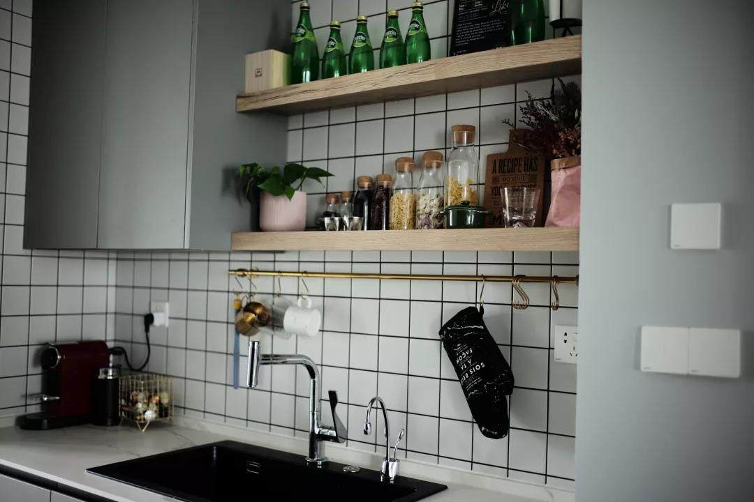 ▲厨房把水槽与灶台隔开,把厨房分成了西厨与中厨区域,水槽区域在里侧作为西餐料理空间,墙面挂着搁板摆放上料理瓶,整体文艺而又实用。