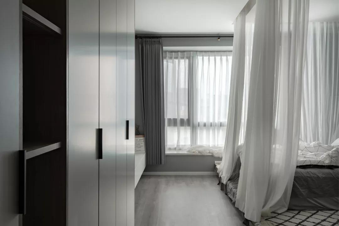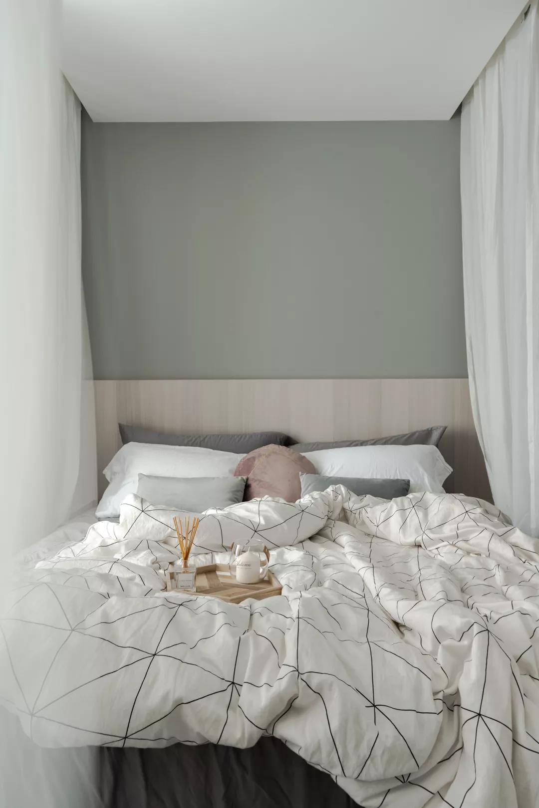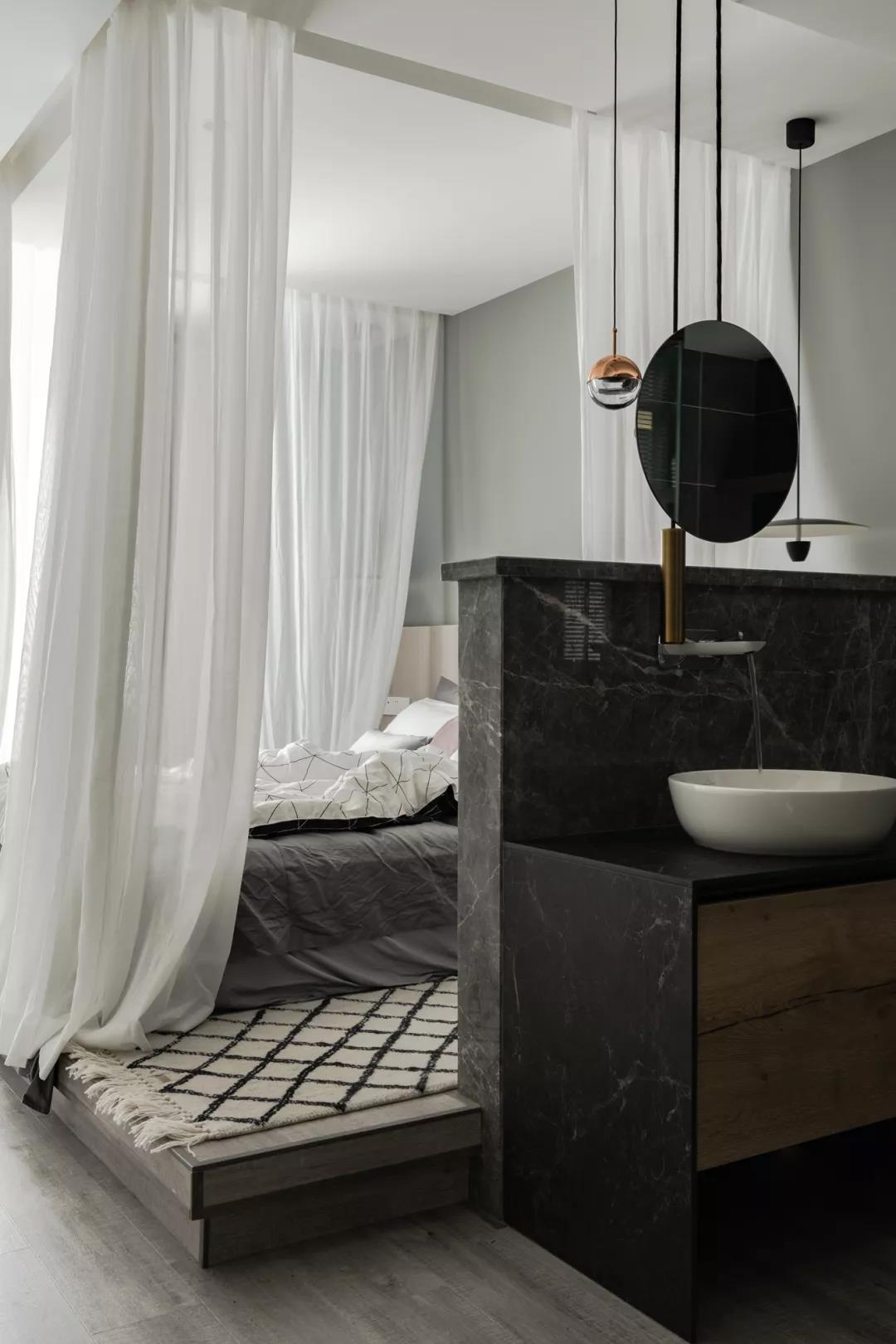 ▲整个床铺区域都以地台抬高,朦胧的纱帘,使得卧室若隐若现的,充满了优雅浪漫的仪式感。