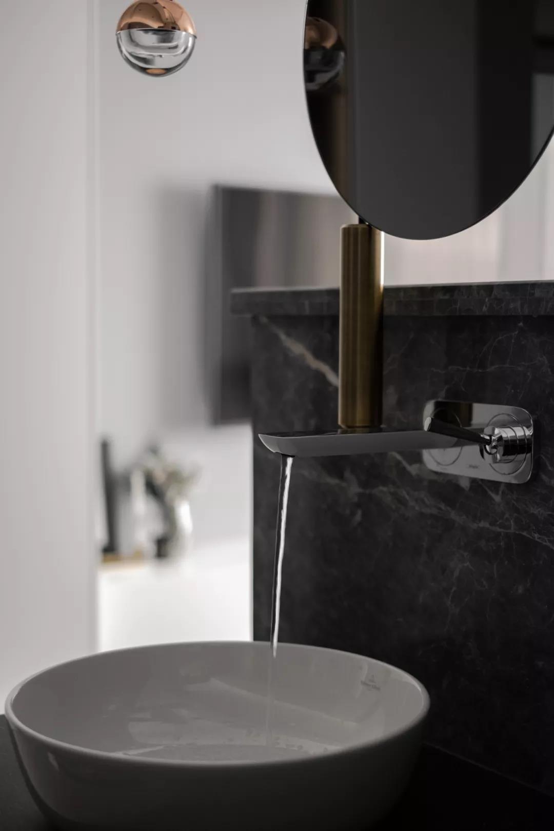 ▲床铺隔着大理石矮墙,后方是一个洗手盆区域,台上盆+铜质感的五金件,开放的空间感,显得端庄自然。