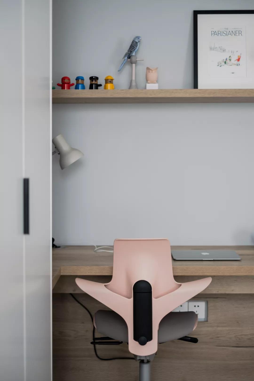 ▲书桌上方的隔板架,上边摆着小手办与装饰画,搭配一张粉色电脑椅,简单童趣的布置,为孩子提供了一个轻松的作业空间。