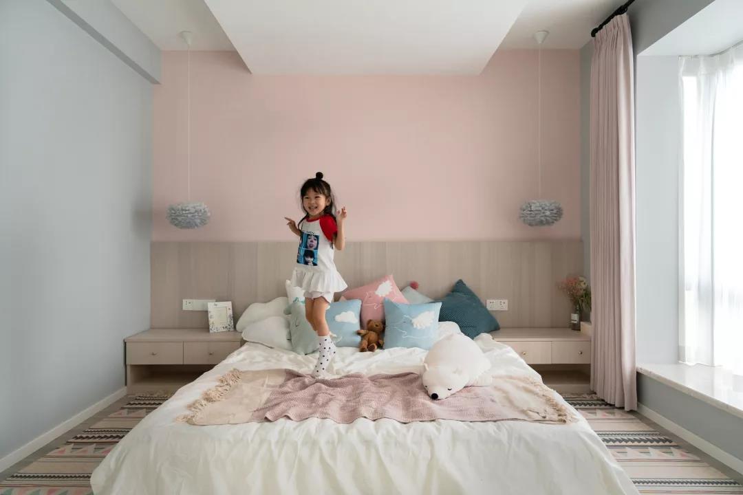 ▲儿童房床头墙是粉色的,靠背的木质护墙板与床头柜连成一体式的,侧边墙面则是蓝灰色的,搭配上温馨可爱的床单抱枕与窗帘,营造出一个童趣浪漫的儿童房空间,看得出孩子对这个空间是欣喜若然。