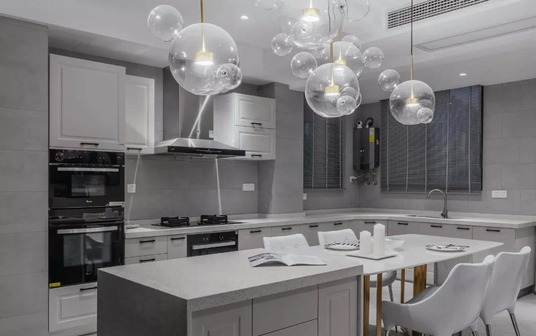 餐厅和厨房是结合在了一起,做了开放式的格局,餐桌椅靠着厨房的岛台来摆放,橱柜、吊柜加上岛台柜,储物空间非常充足。