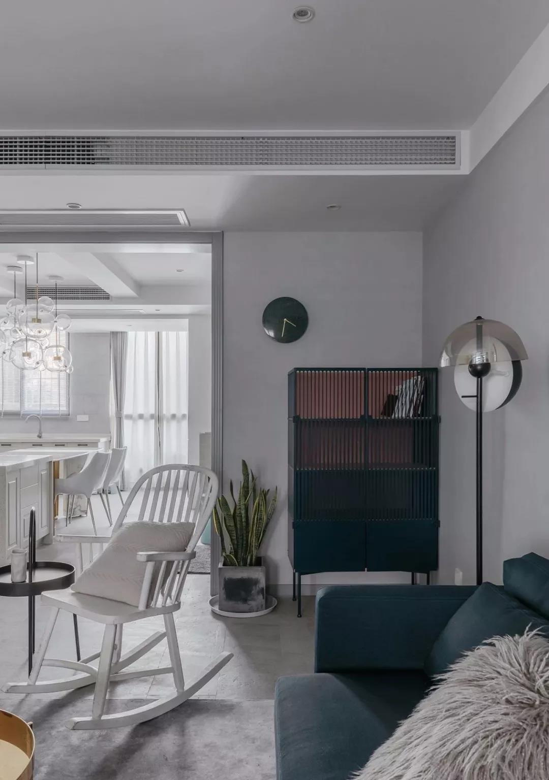 在客厅的角落里摆放绿植和书柜,再加上摇椅和落地灯,这个客厅的角落也可以作为屋主阅读、休闲的地方。