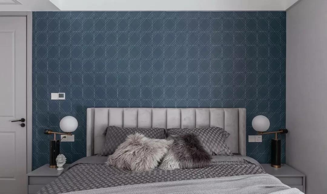主卧室的床头背景墙铺贴了蓝灰色带纹理的壁纸,搭配浅灰色的床品和床,整体给人一种轻松、舒适的感觉。床头两侧对称的床头灯带来精致的感觉。