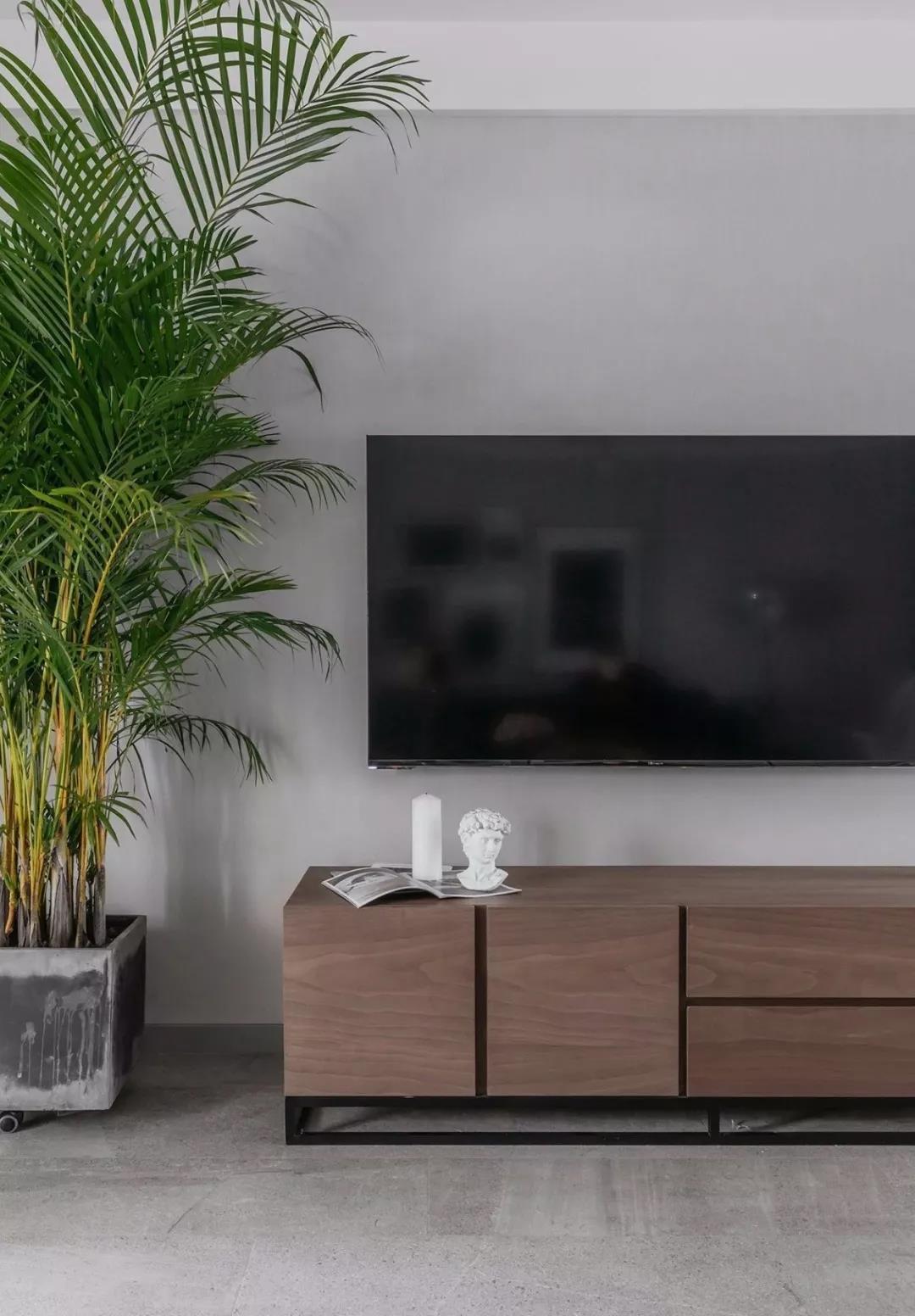 木质的电视柜上方是壁挂电视,线路都隐藏在了电视的背后,整体看起来更为整洁。水泥花盆搭配大件的绿植,给客厅增添一些自然感。