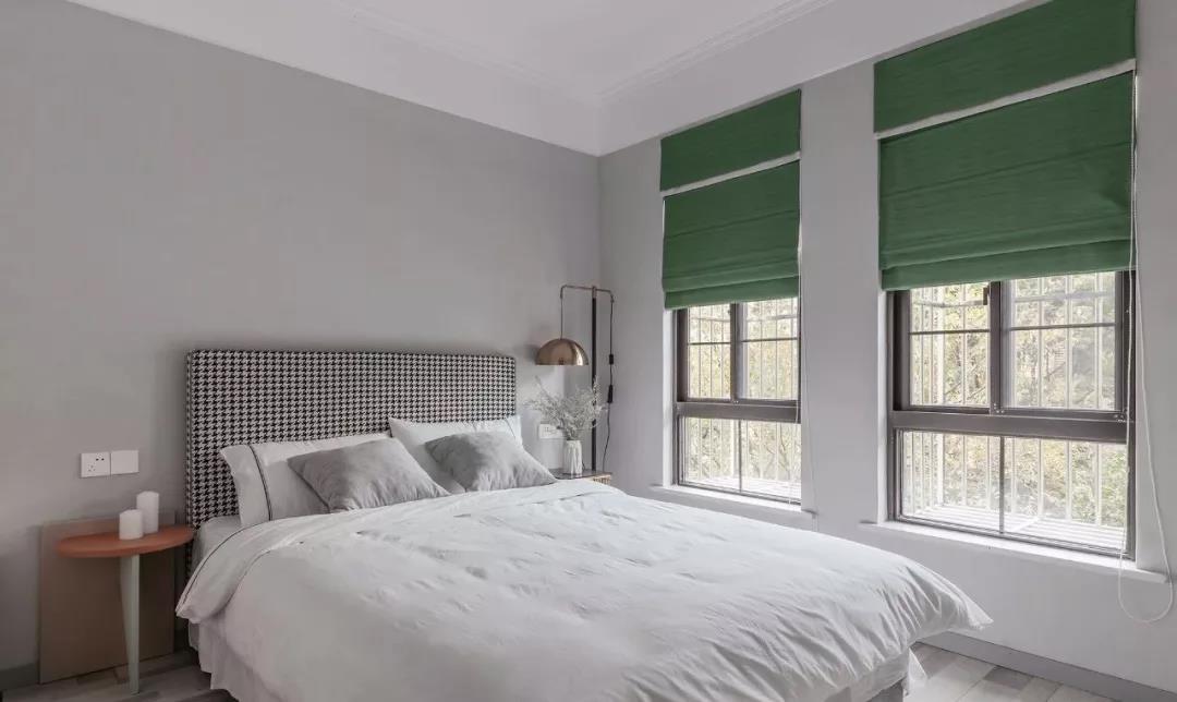次卧的设计会更为素雅一些,整体以灰色为主,搭配白色的床品和绿色的窗帘,在角落里放着一个别致的落地灯,更是创意时尚。