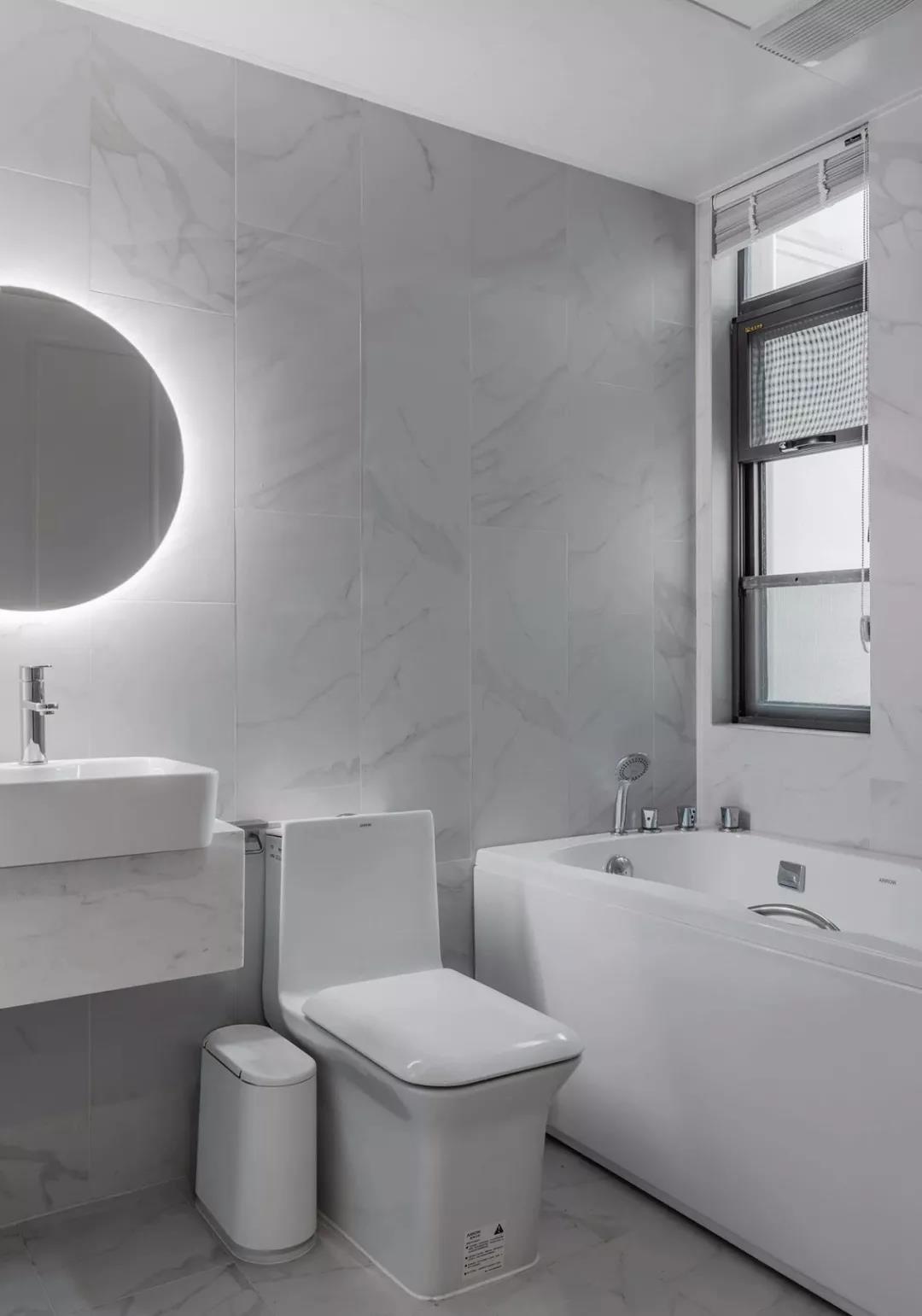 卫生间内部做了一个浴缸,方便屋主工作之后能够享受泡澡时光。浅灰色的大理石瓷砖搭配圆形的藏光浴室镜,让人感觉更有质感。