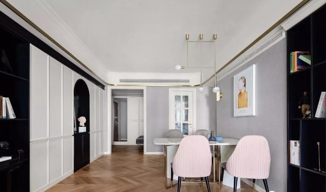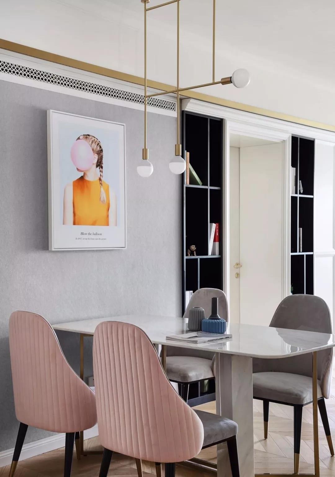 餐厅的墙面刷成了浅灰色,与餐椅坐垫相互呼应,大理石与金属元素构造的餐桌搭配粉色的椅背,让人感觉优雅而又精致。