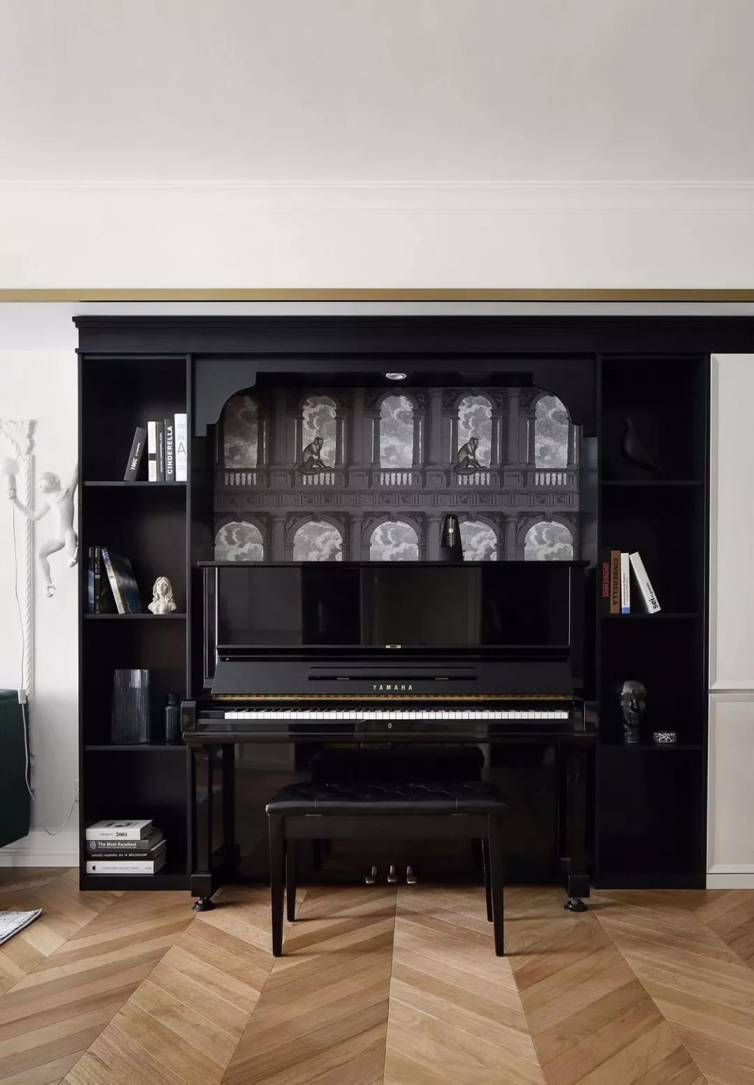 餐厅的两侧都是做了嵌入式的储物柜,其中一侧还摆放了一架钢琴,黑色的柜子中留空部分做了背景墙的设计,非常好看。
