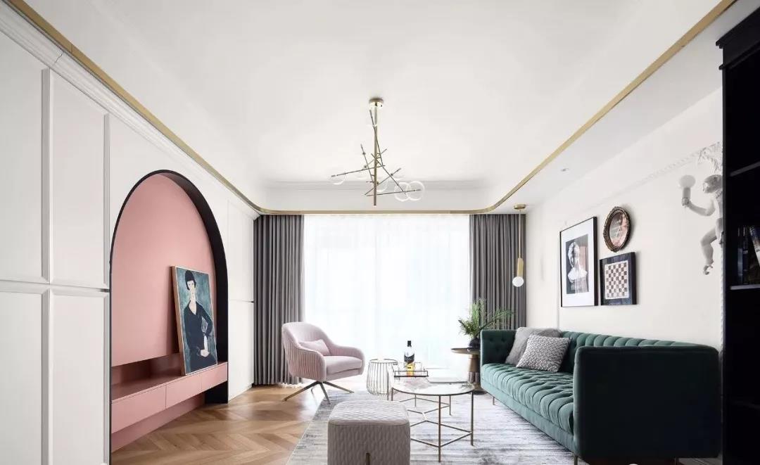 客厅的电视背景墙也设计得非常有趣,电视区域刷成了粉红色,还做了拱门的造型,搭配一个精致的、复古款式的沙发,让人感觉非常有格调感。