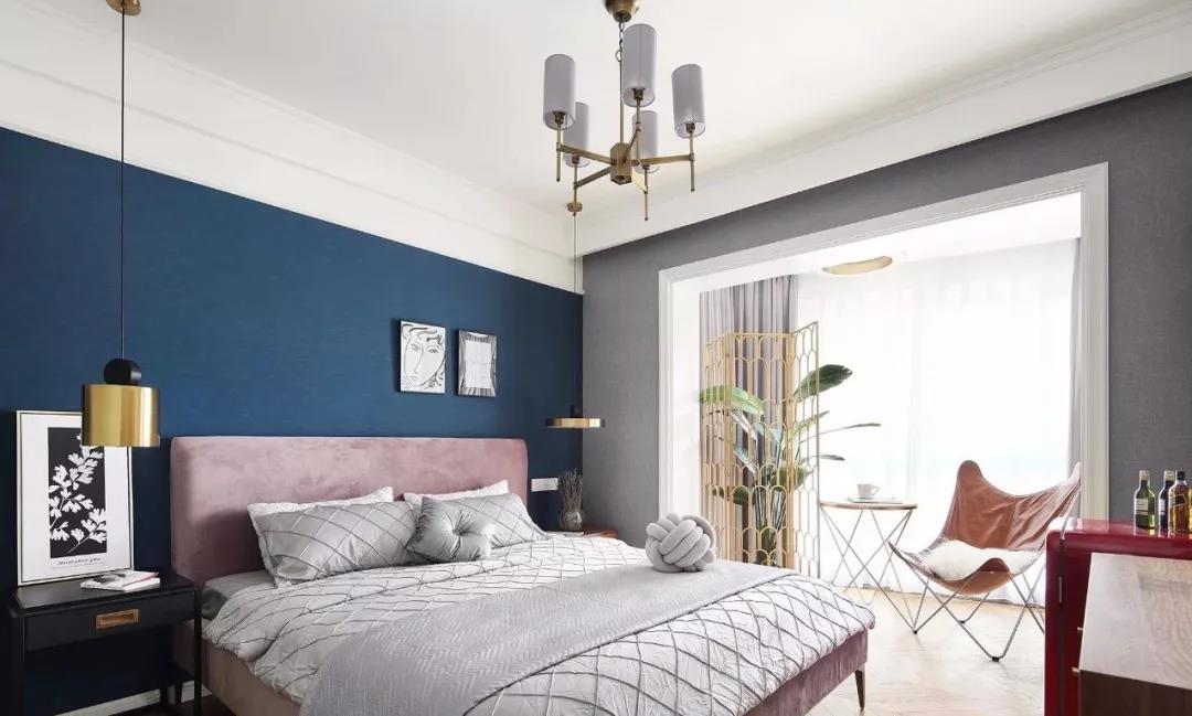 主卧室的床头背景墙刷成了蓝色,搭配一张粉色的床和灰色的床品、窗帘、墙面,整个卧室的配色非常多样化,但却不会显得太过杂乱。