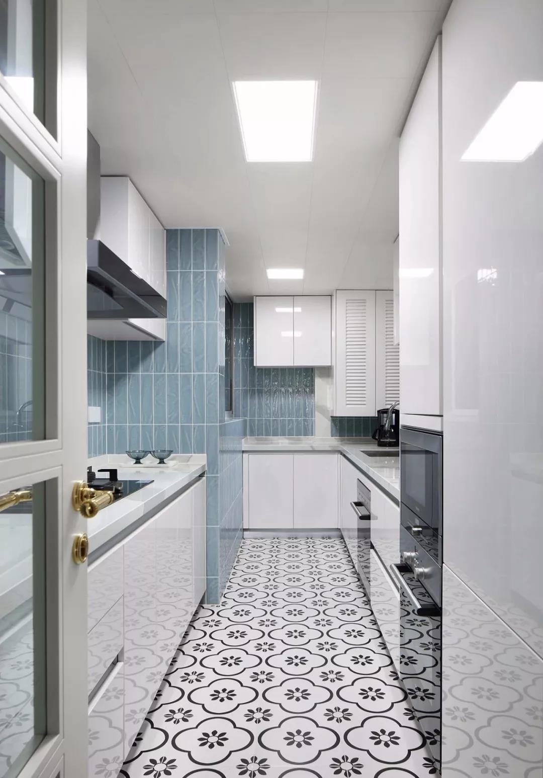 厨房的设计以小清新为主,地面铺贴黑白色的花砖,墙砖选择了蓝色系,L型的橱柜搭配另一侧的一字型橱柜,满足收纳和使用需求。
