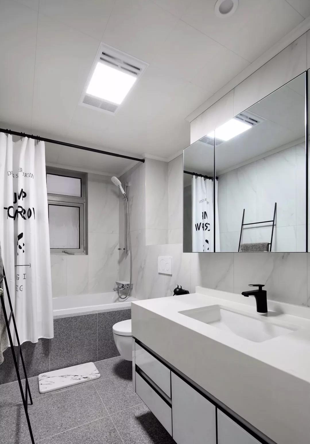 次卫是做了一个浴缸的设计,给浴缸搭配浴帘,可以避免水汽溅到外面。灰色与白色的结合在明亮的灯光和镜柜衬托下,显得更为明亮、轻松。