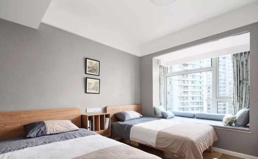 次卧的设计就会更为素雅一些,墙面刷成了灰色系,两张木质床的中间摆放床头柜,三色的床品也是以简约的色调为主,整体给人一种舒适感。