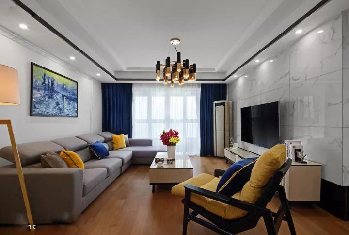 客厅的电视背景墙铺贴了大理石瓷砖,地面铺贴木地板,和其他人家里相反的设计,让这个客厅显得独特而又大方。