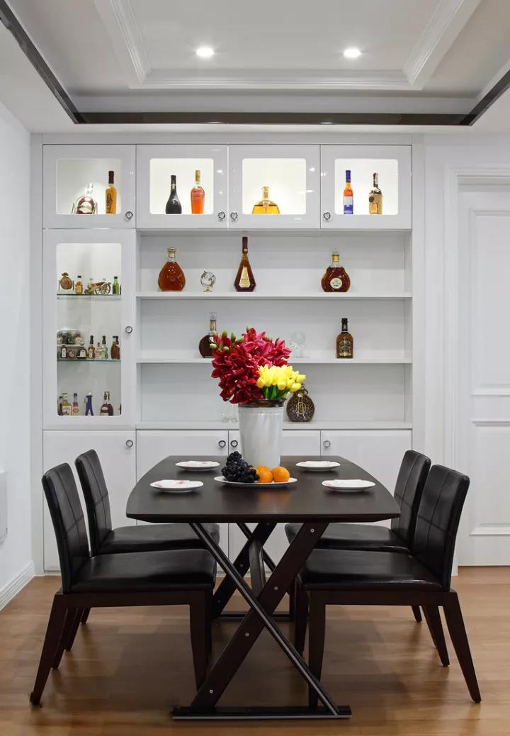在餐厅的另一侧还做了嵌入式的酒柜,玻璃柜门加上藏光的设计,让酒也成为餐厅装饰的一部分,显得更加的奢华和大气。